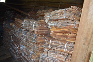 Malkakattojen nykyisestä ja tulevasta kunnostuksesta kertoo vierailijalle esimerkiksi se, että yhdessä ulkorakennuksessa on iso kasa niputettuja tuohia.