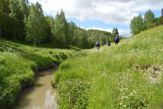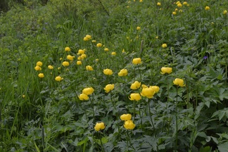 ![]() Luontopolkua sivuavan puron toisella puolella kasvaa kulleroita. |